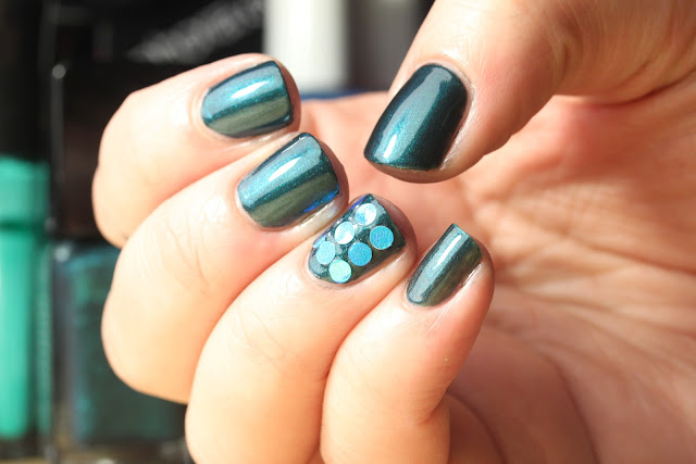 The Verdict: I'm disappointed. On the close-up this polish is full of shimmery particles but you have to look so close to see it. From far away it's just meh, especially for the price. I want to do more with the circular glitter you see here, I'll talk more about that in another post.